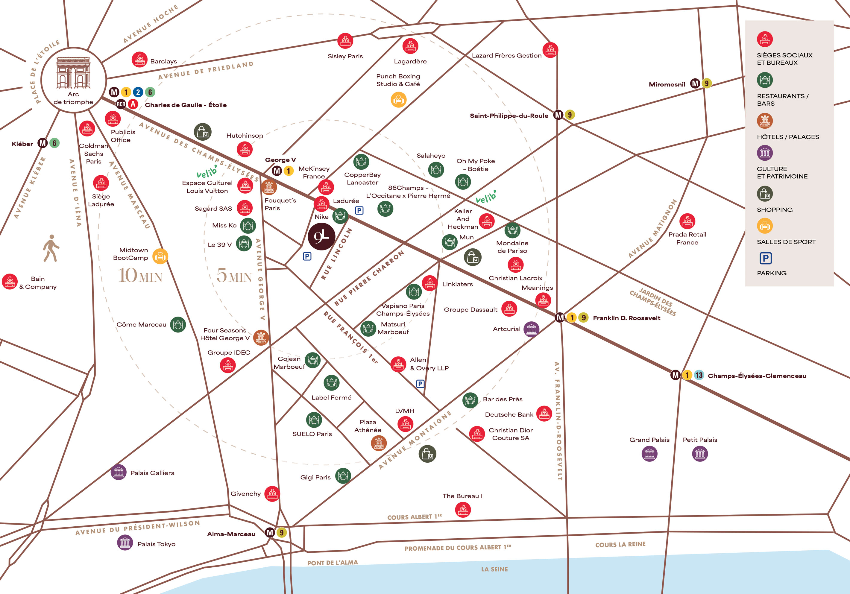 Situé au 9 rue Lincoln, dans le 8ᵉ arrondissement de Paris, l’immeuble bénéficie d’une localisation privilégiée à proximité immédiate de l’avenue des Champs-Élysées et de la rue François 1er.