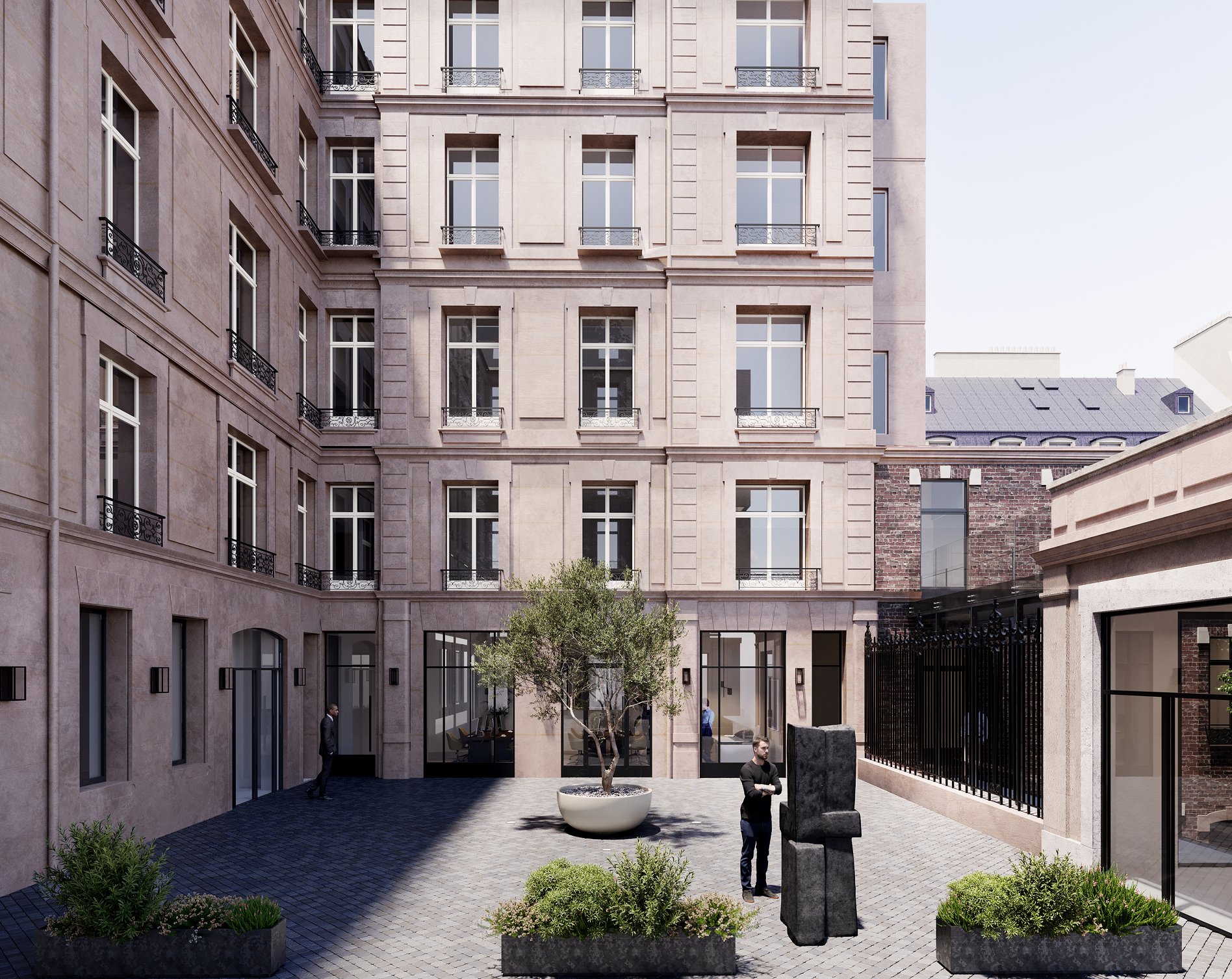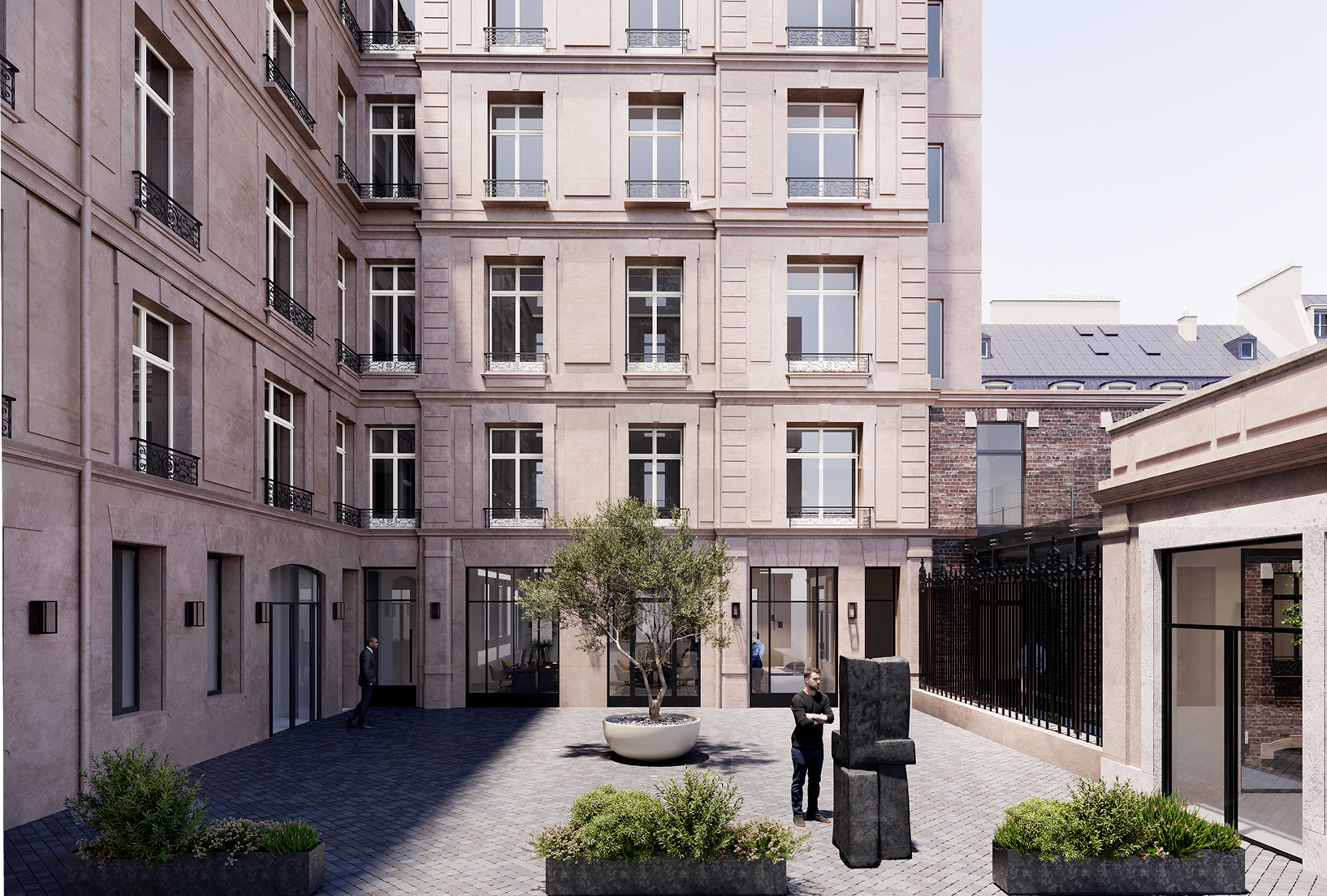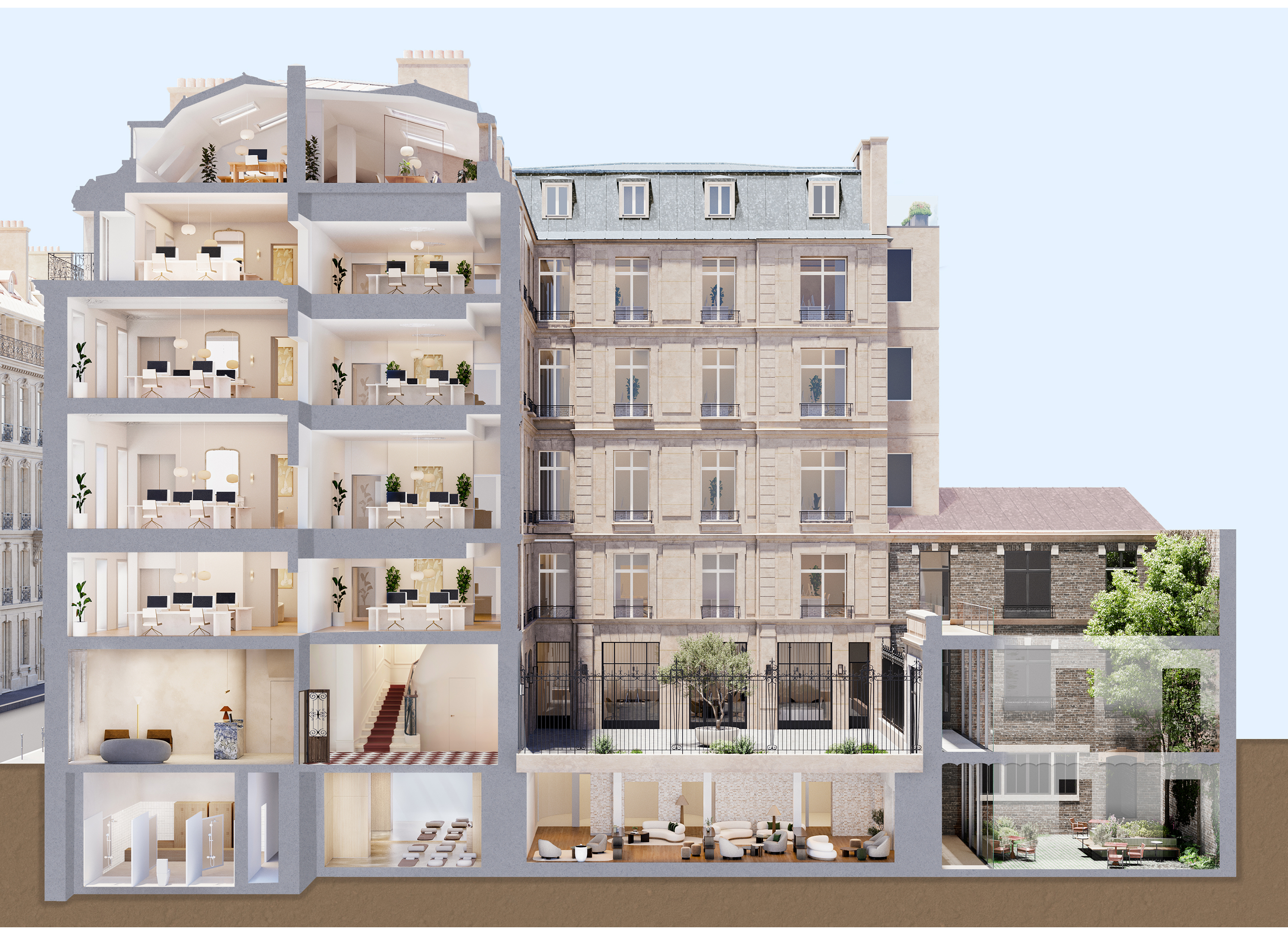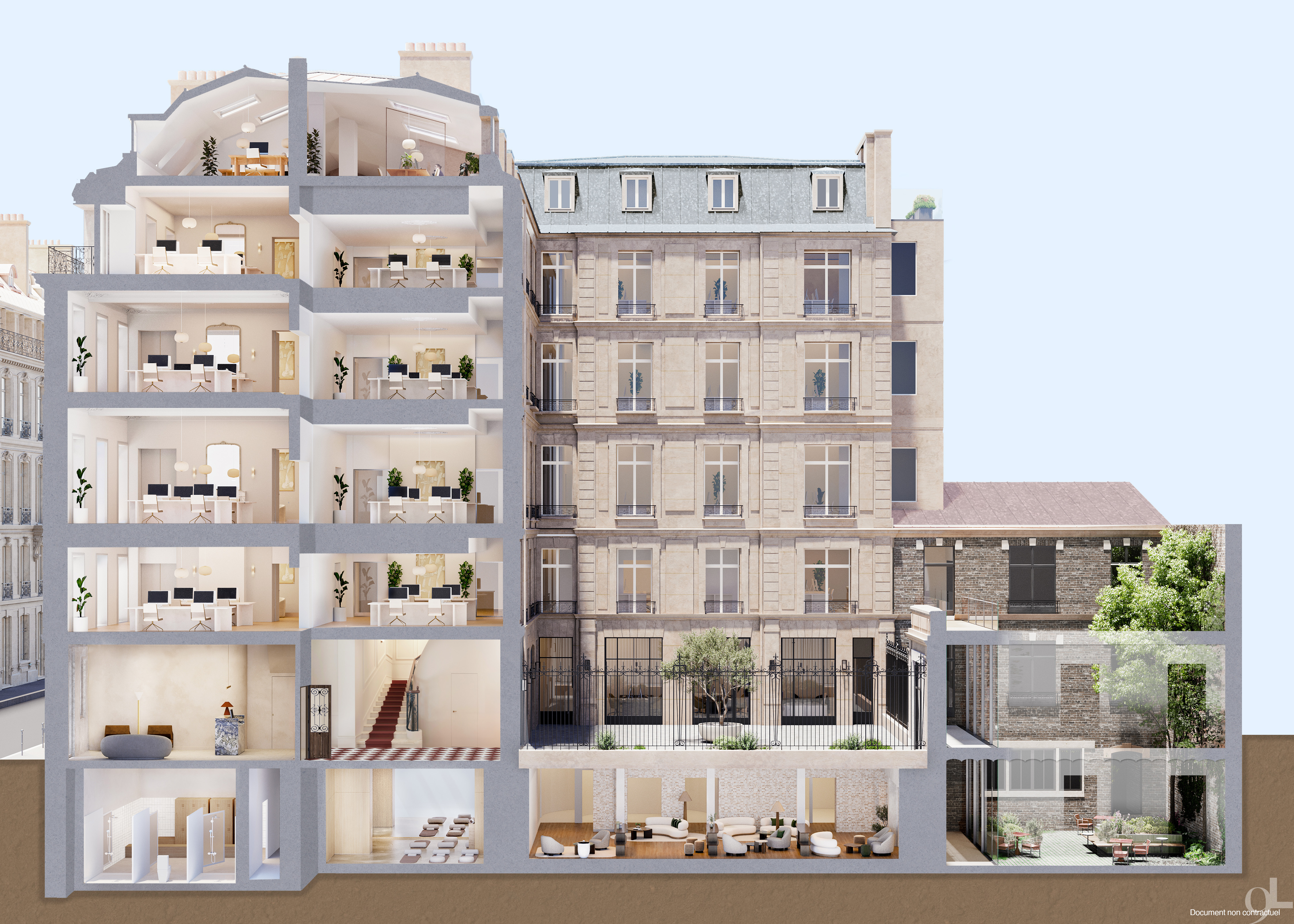- Surfaces techniques & extension : création d’un sous-sol partiel pour accueillir les locaux techniques (chauffage urbain CPCU, climatisation Fraîcheur de Paris, ventilation double flux).