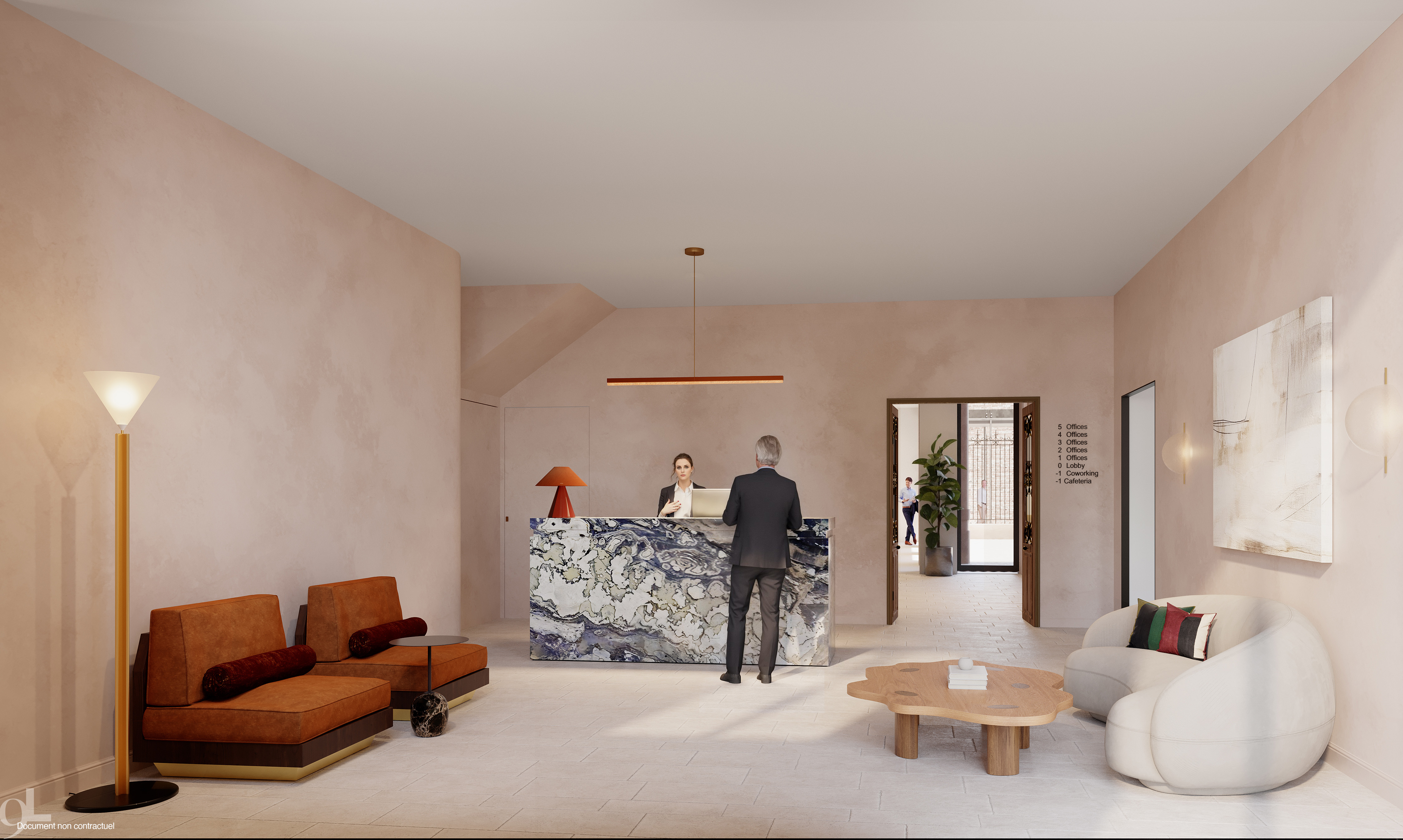 - Réaménagement intérieur : décloisonnement des espaces pour créer des plateaux de bureaux flexibles, aménagement de salles de réunion et de locaux de services, création d’un local vélo intérieur avec 15 emplacements, accessible directement depuis la rue.