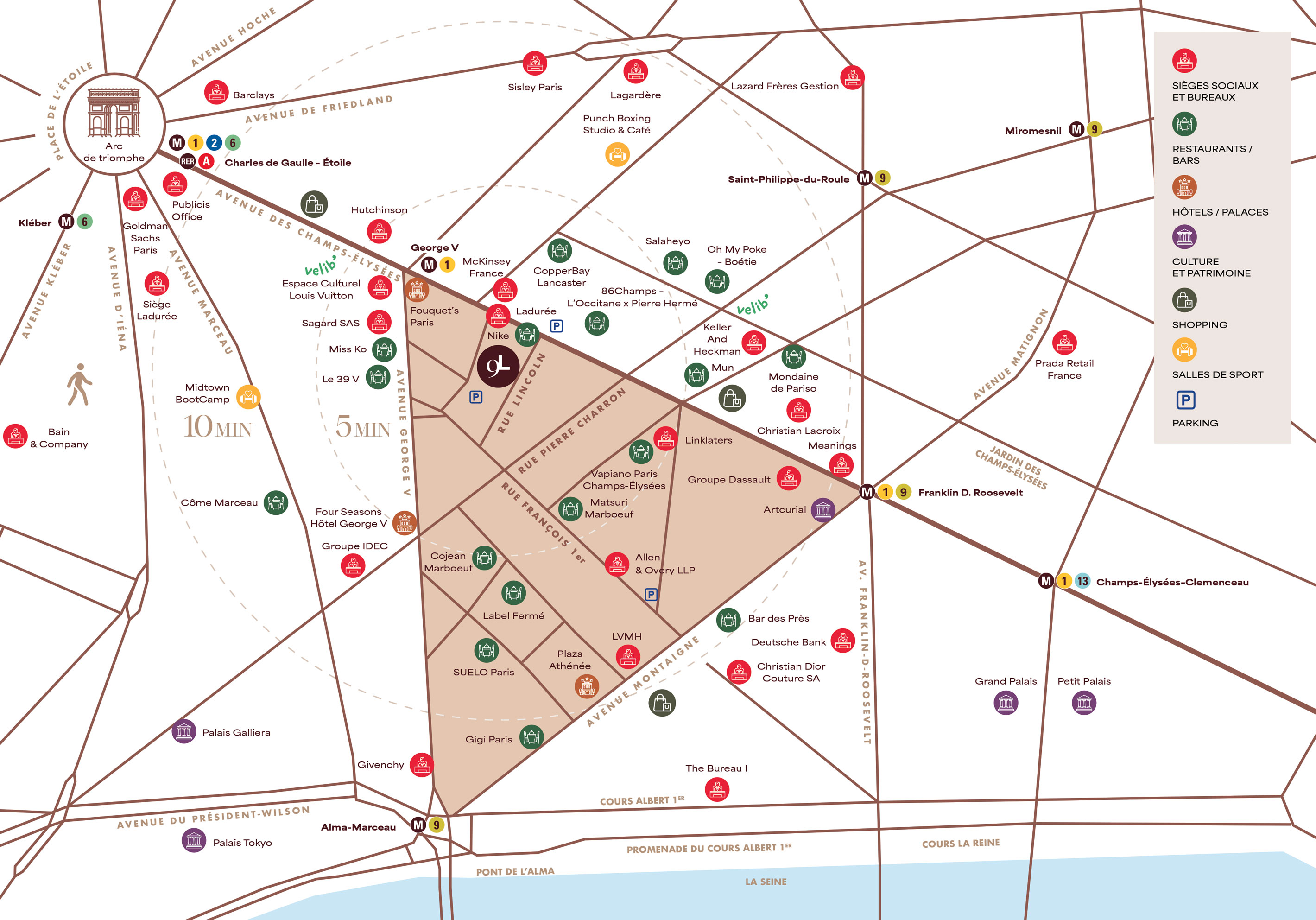 Situé au 9 rue Lincoln, dans le 8ᵉ arrondissement de Paris, l’immeuble bénéficie d’une localisation privilégiée à proximité immédiate de l’avenue des Champs-Élysées et de la rue François 1er.